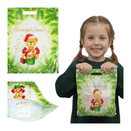 GRALA nabízí reklamní tašku, vánoční tašku s potiskem "medvídka Santy", s uchem (ledvinkou) dodatečně vyztuženým vložkou a s certifikátem PZH (Polský národní hygienický institut) pro styk s potravinami.