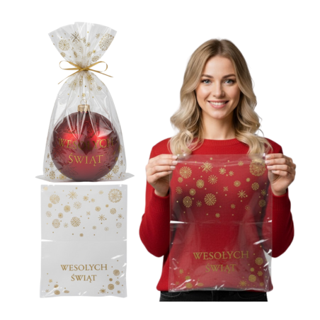 Der Zellophanbeutel mit dem festlichen, doppelseitigen Golddruck "Frohe Weihnachten" und den Sternen eignet sich perfekt zum Verpacken von Geschenken.